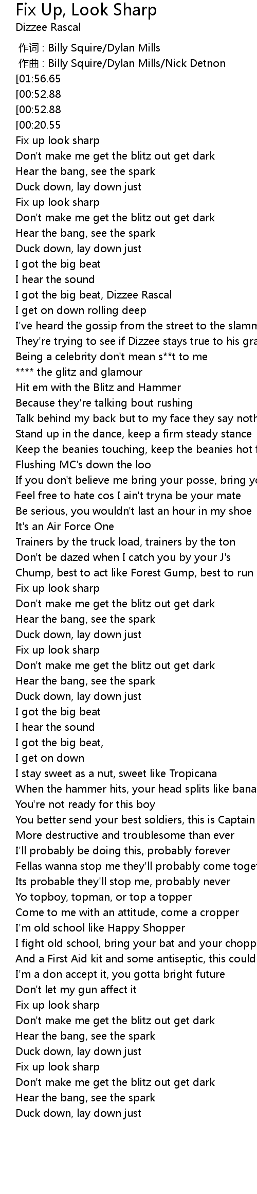 | [00:58.89] | They're trying to see if Dizzee stays true to his grammar |