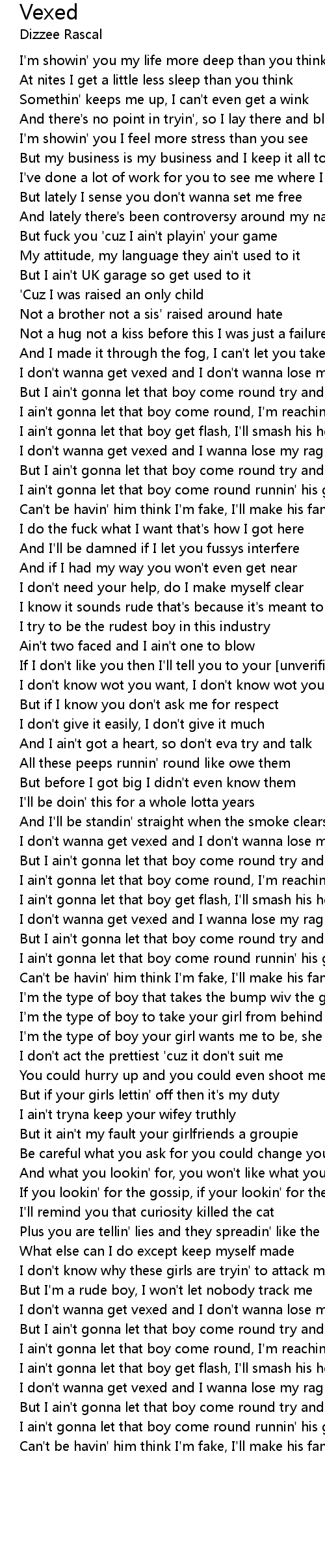 I don't wanna get vexed and I wanna lose my rag |