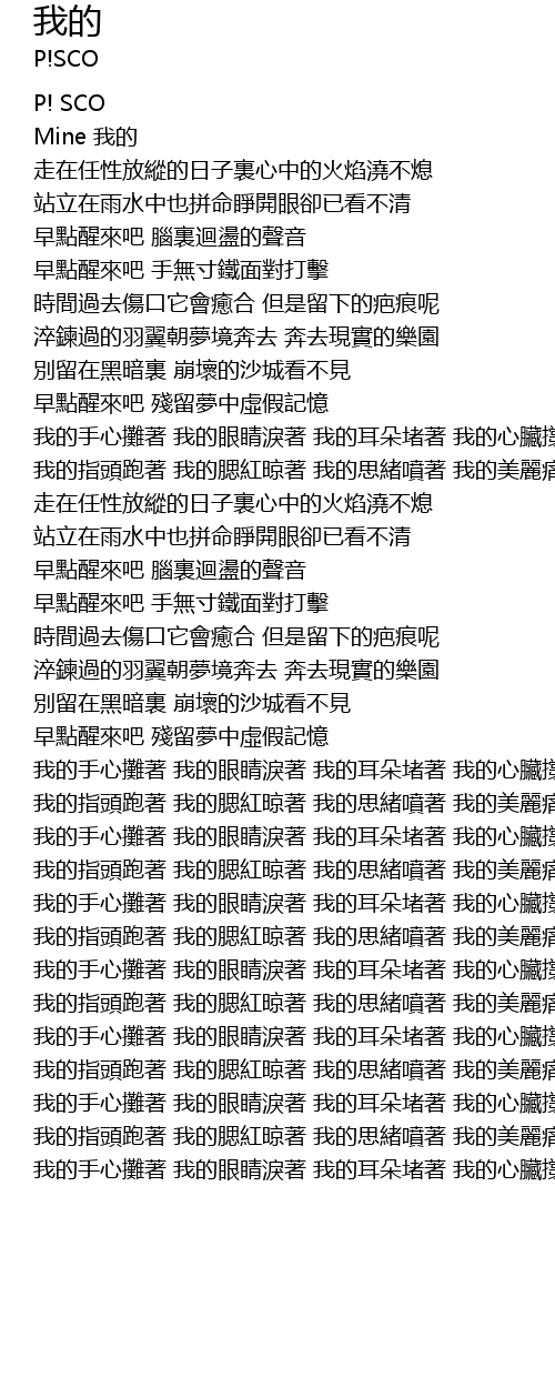 | 我的指頭跑著 我的腮紅晾著 我的思緒噴著 我的美麗痛著 | |