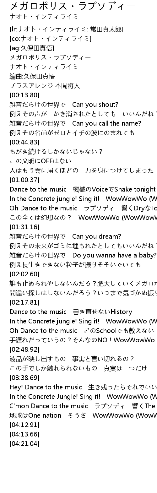 | [01:16.04] | Oh Dance to the music ラプソディー響くDryなTown |