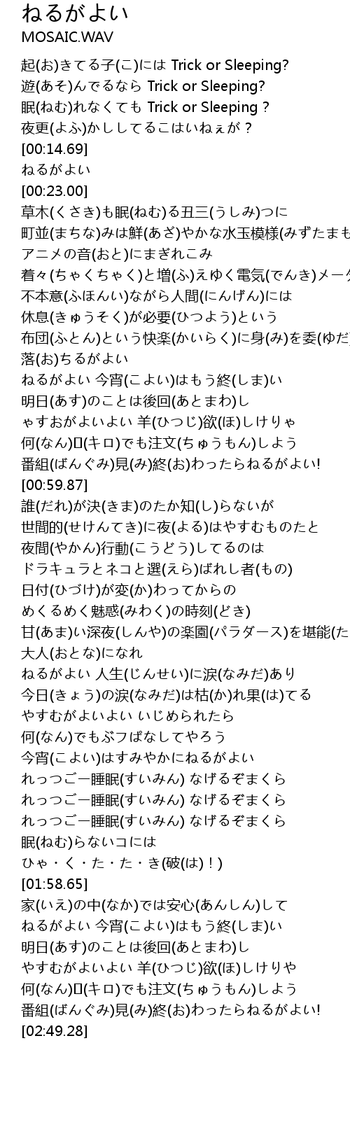 | [00:09.21] | 眠(ねむ)れなくても Trick or Sleeping? |