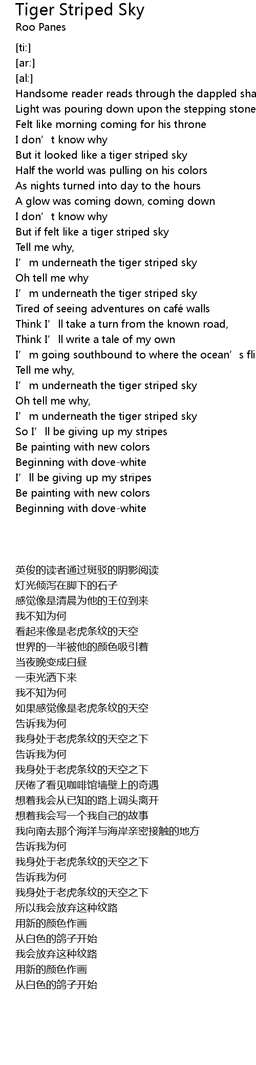| [00:46.52] | But if felt like a tiger striped sky |