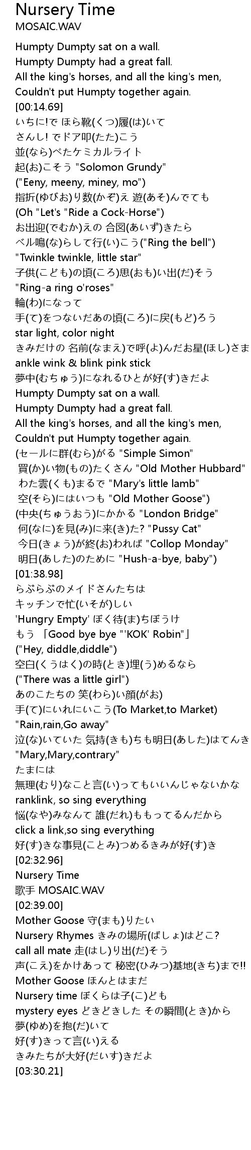 | [00:10.98] | Couldn' t put Humpty together again. |