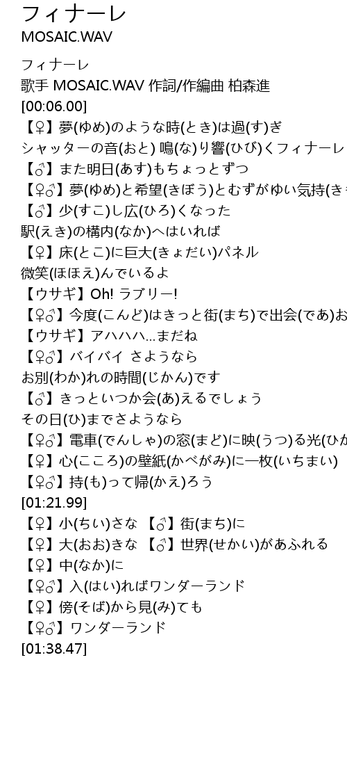 | [00:03.00] | 歌手 MOSAIC.WAV 作詞/作編曲 柏森進 |