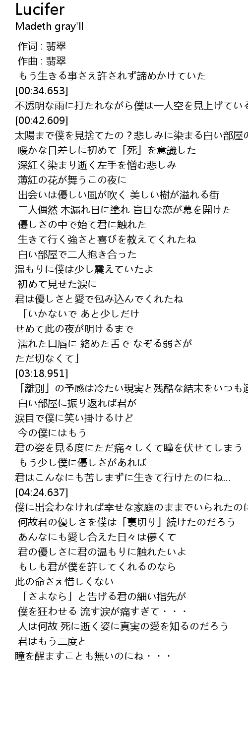 | [04:07.610] | もう少し僕に優しさがあれば 君はこんなにも苦しまずに生きて行けたのにね… |