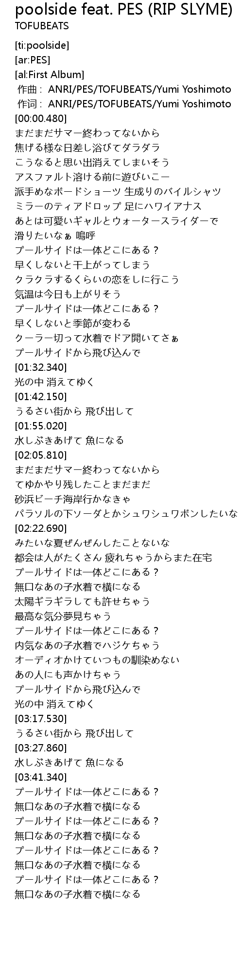| [00:00.160] | 作词 : ANRI/PES/TOFUBEATS/Yumi Yoshimoto |