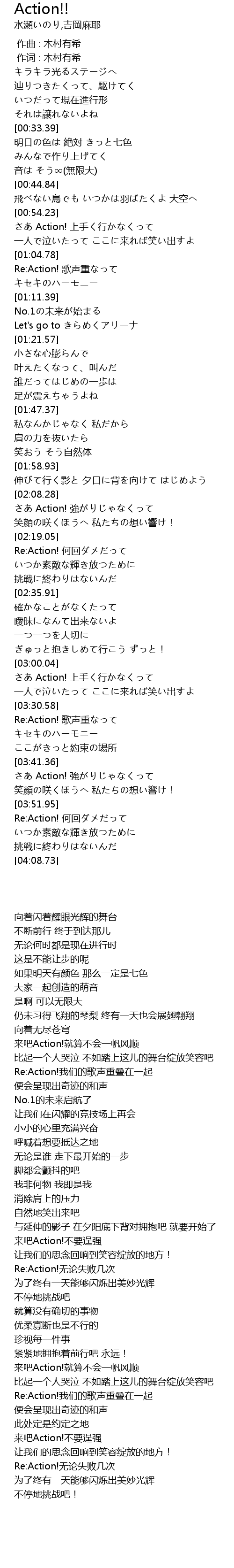 | [03:30.85] | Re:Action!我们的歌声重叠在一起 |