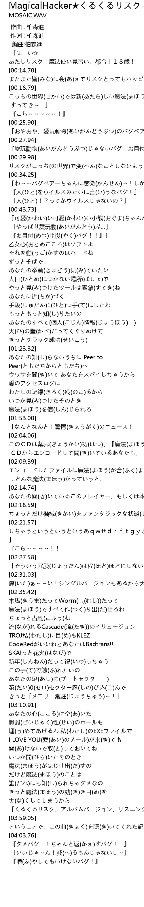 | [03:55.55] | 「くるくるリスク、アルバムバージョン、リスニング記念(きねん)!わ~~~♪ |