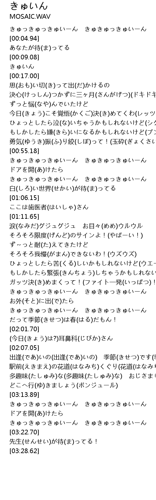 | [03:19.70] | きゅっきゅっきゅいーん きゅきゅっきゅいーん |