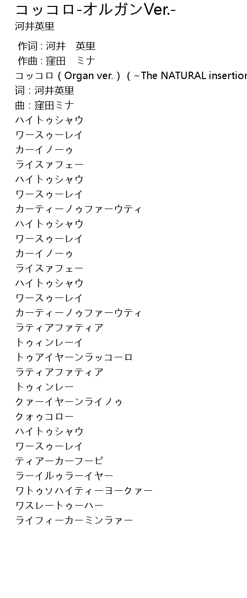| [00:00.496] | コッコロ(Organ ver.)(~The NATURAL insertion)-河井英里 |