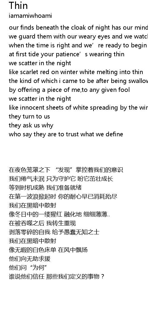 | [01:28.00] | 像冬日中的一缕猩红 融化地 细细薄薄.. |