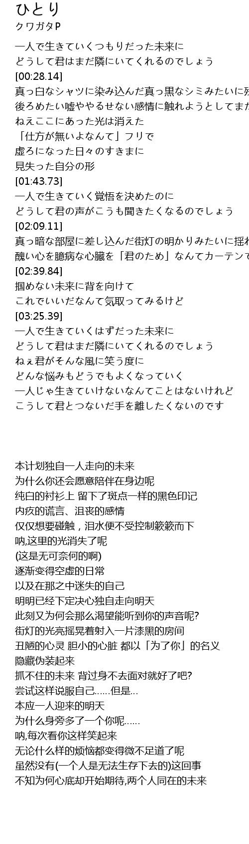 | [00:14.70] | どうして君はまだ隣にいてくれるのでしょう |