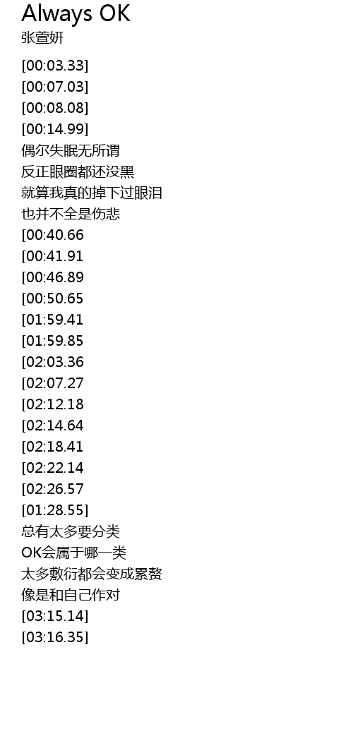 | [02:59.63][02:14.64][01:12.71] | 怎么你永远说OK |