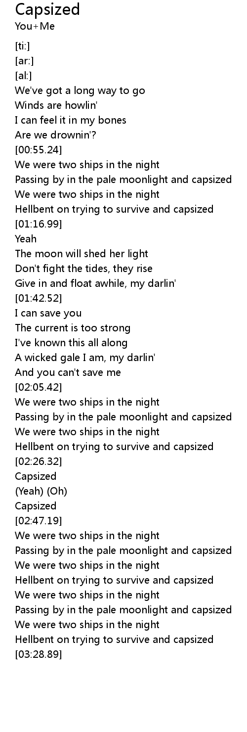 | [01:09.98] | Hellbent on trying to survive and capsized |