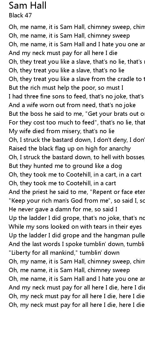 | Oh, me name, it is Sam Hall and I hate you one and all | |
