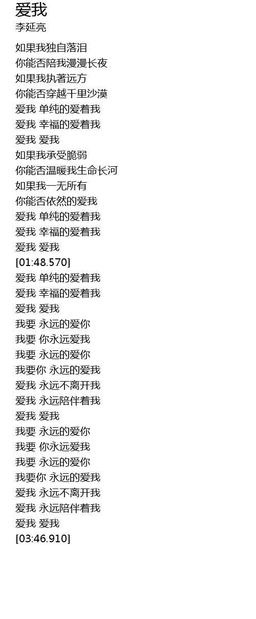 | [03:11.530] | wǒ yào nǐ yǒng yuǎn ài wǒ |