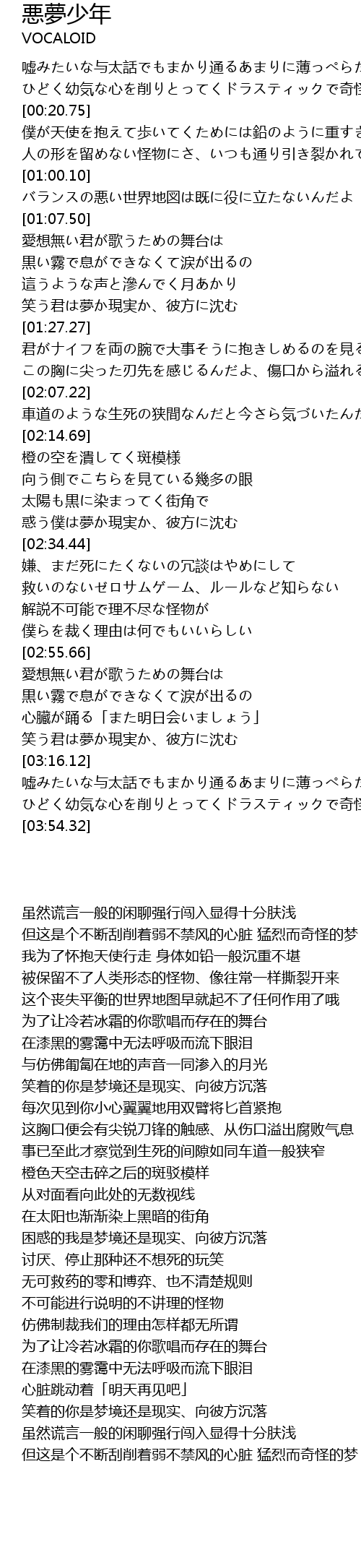 | [00:11.20] | ひどく幼気な心を削りとってくドラスティックで奇怪な夢さ |