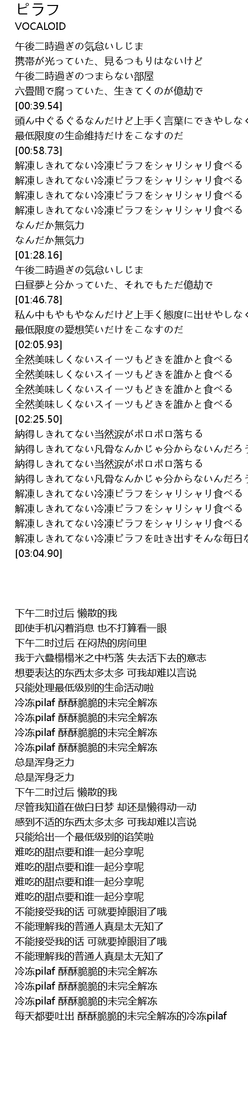 | [02:59.50] | 每天都要吐出 酥酥脆脆的未完全解冻的冷冻pilaf |