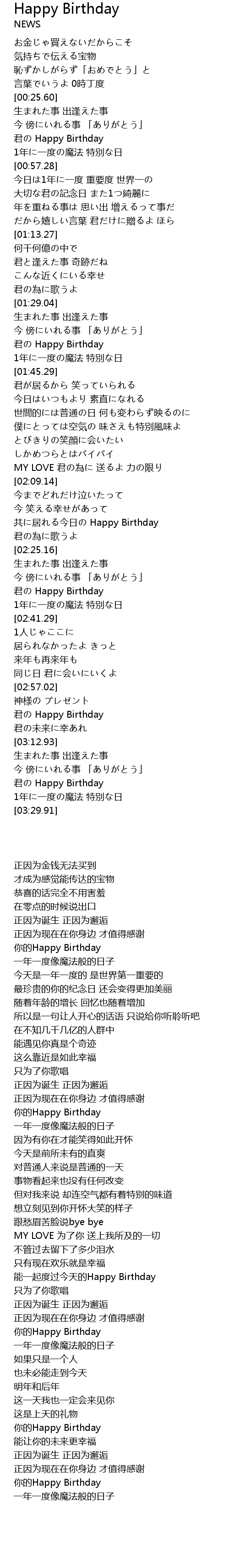 | [02:17.71] | gòng jū jīn rì Happy Birthday |