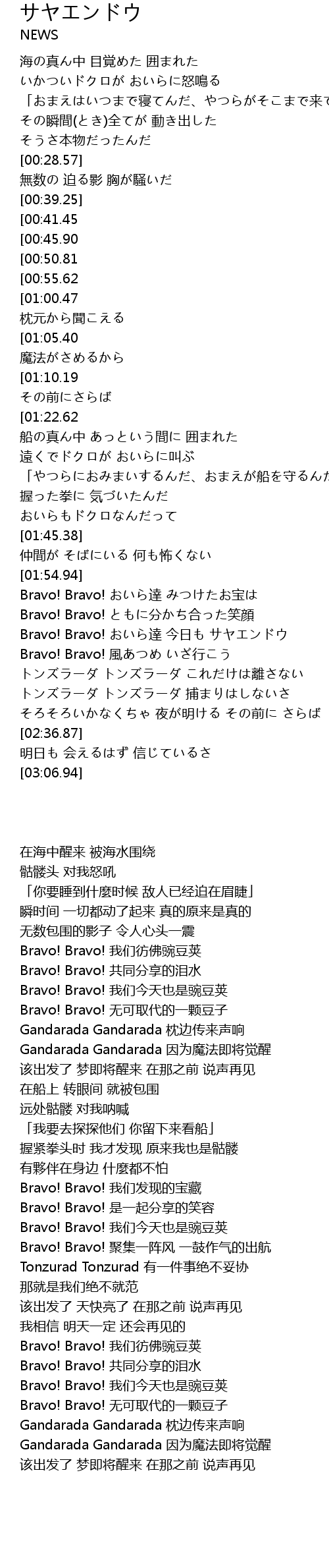 | [03:21.93][00:55.62] | Bravo! Bravo! かけがえのないワンピース |