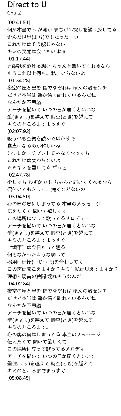 | [04:56.82] | 壁(きょり)を越えて 時空(とき)を越えて キミのところまでまっすぐ |