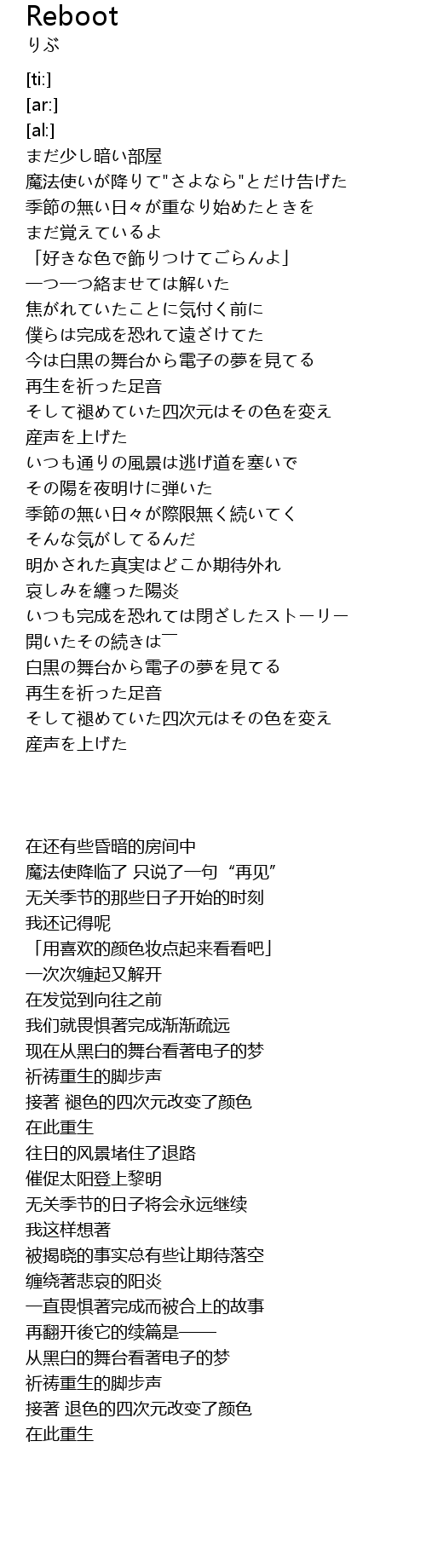 | [03:33.13] | 白黒の舞台から電子の夢を見てる |