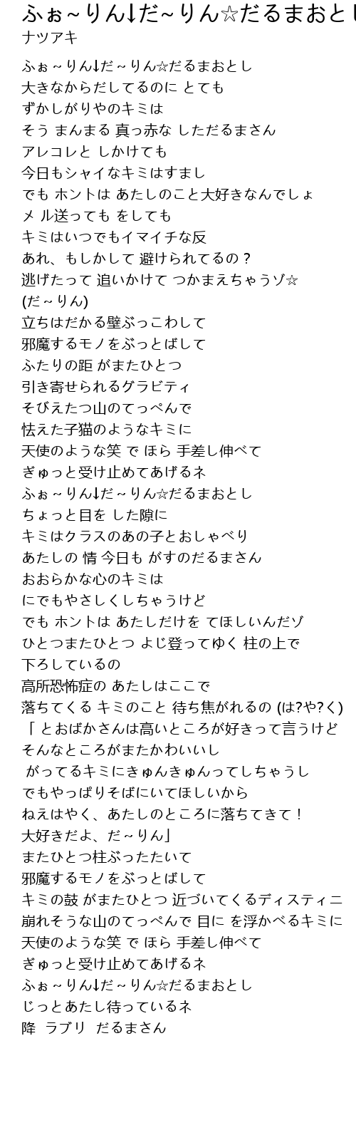 | [00:31.300] | そう まんまる 真っ赤な しただるまさん |