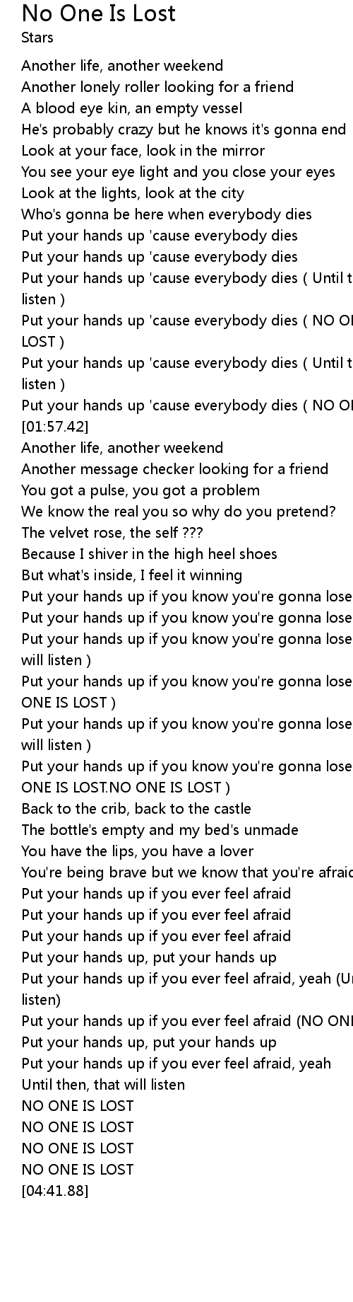 | [03:00.74] | Put your hands up if you know you' re gonna lose NO ONE IS LOST. NO ONE IS LOST. NO ONE IS LOST |