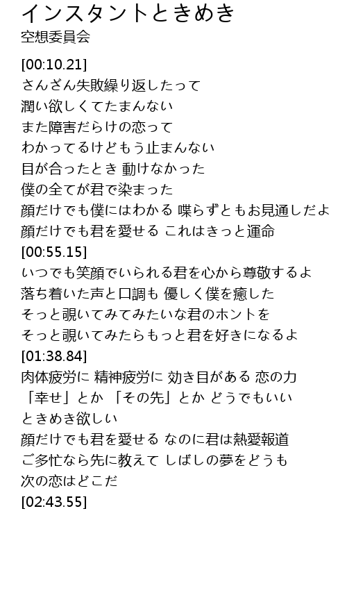 | [02:08.54] | 「幸せ」とか 「その先」とか どうでもいい ときめき欲しい |