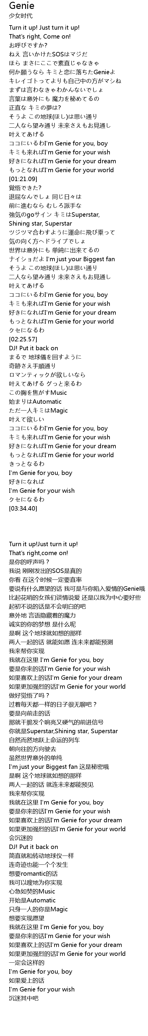 | [00:29.81] | 要说有什么愿望的话 我可是与你陷入爱情的Genie哦 |