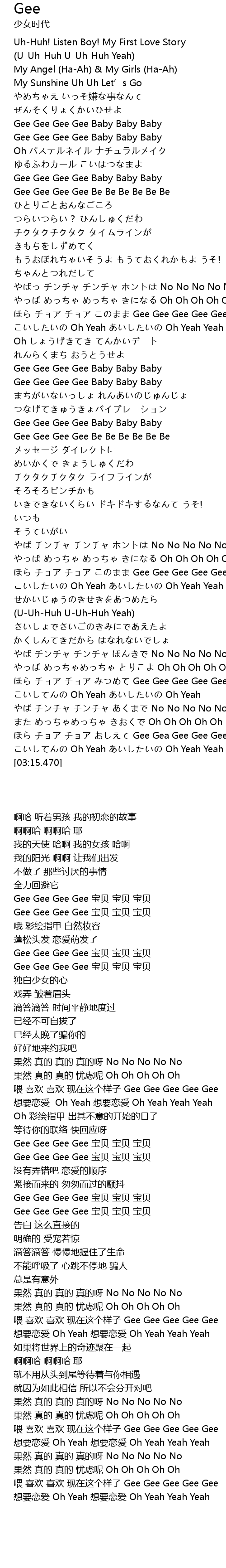 | [00:37.410] | Gee Gee Gee Gee 宝贝 宝贝 宝贝 |