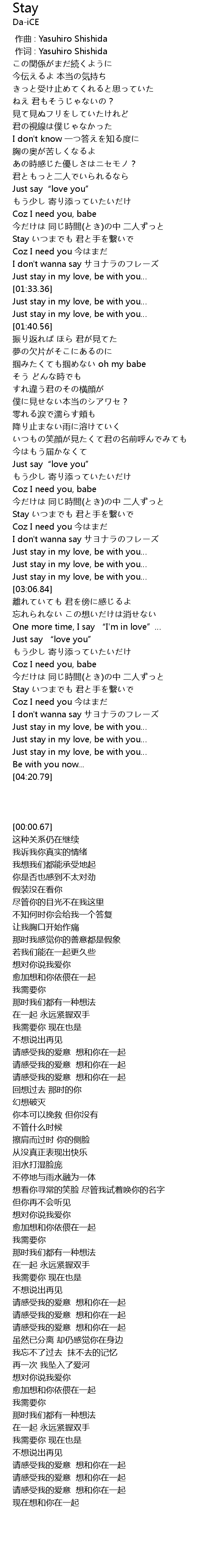 | [03:52.36] | Stay いつまでも 君と手を繋いで |