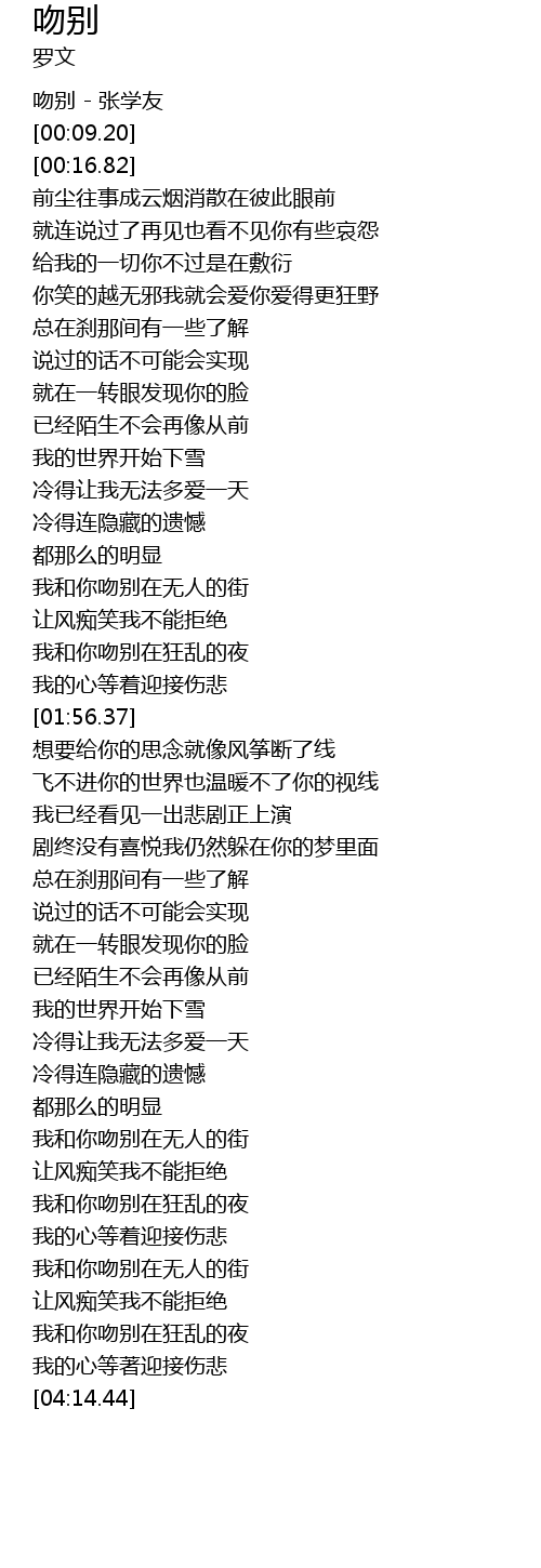 | [00:00.72] | 吻别 - 张学友 |