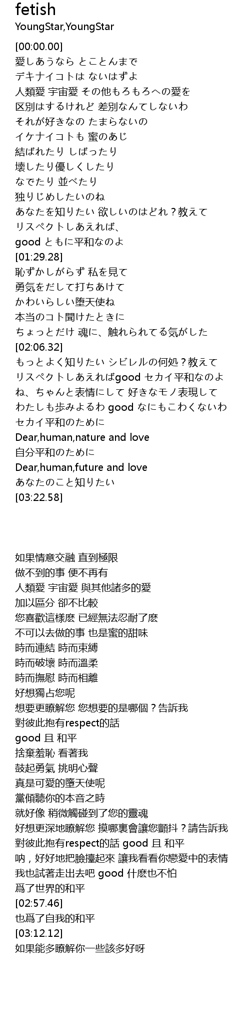 | [02:27.77] | リスペクトしあえればgood セカイ平和なのよ |