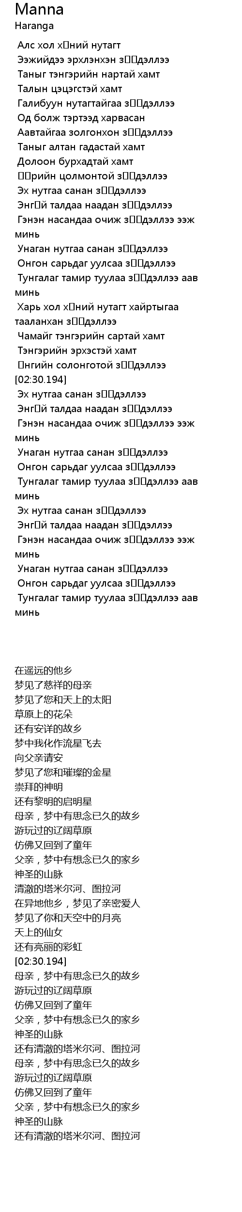 | [02:56.029] | Тунгалаг тамир туулаа зүүдэллээ аав минь |