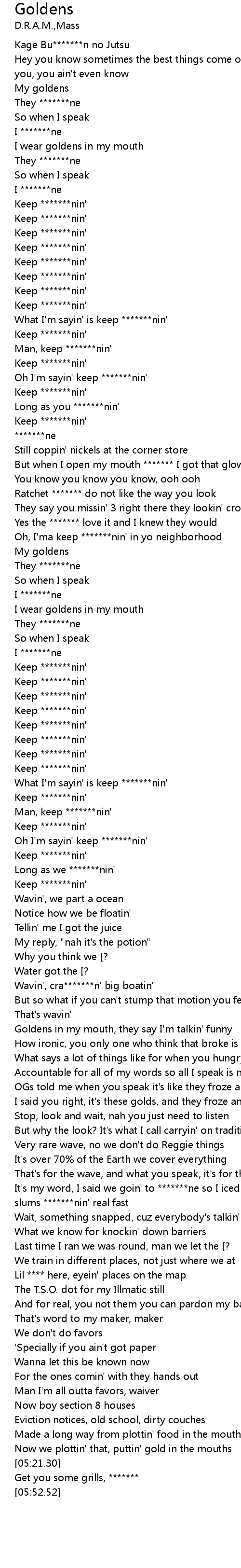 | [04:30.91] | It's my word, I said we goin' to *******ne so I iced all the ice, slums *******nin' real fast |