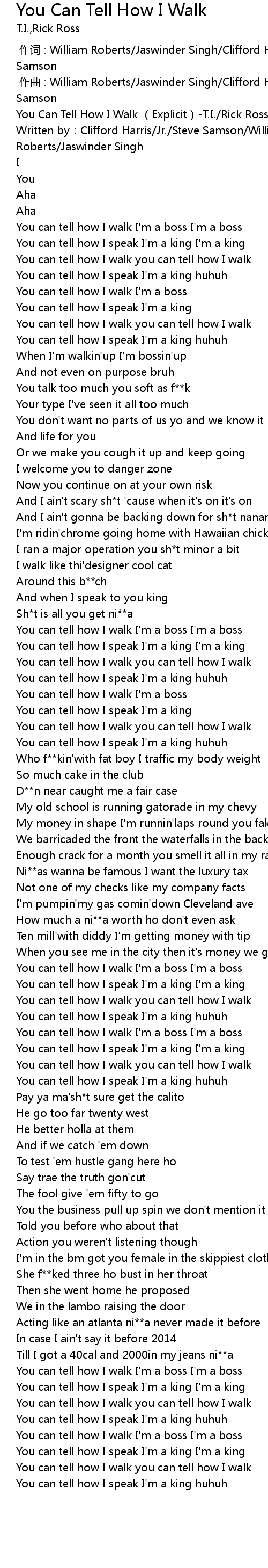 | [00:00.218] | You Can Tell How I Walk Explicit T. I. Rick Ross |