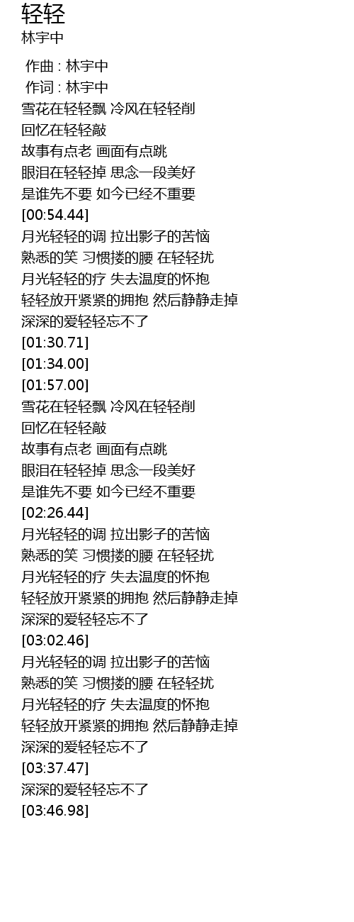 | [03:24.21] | 轻轻放开紧紧的拥抱 然后静静走掉 |