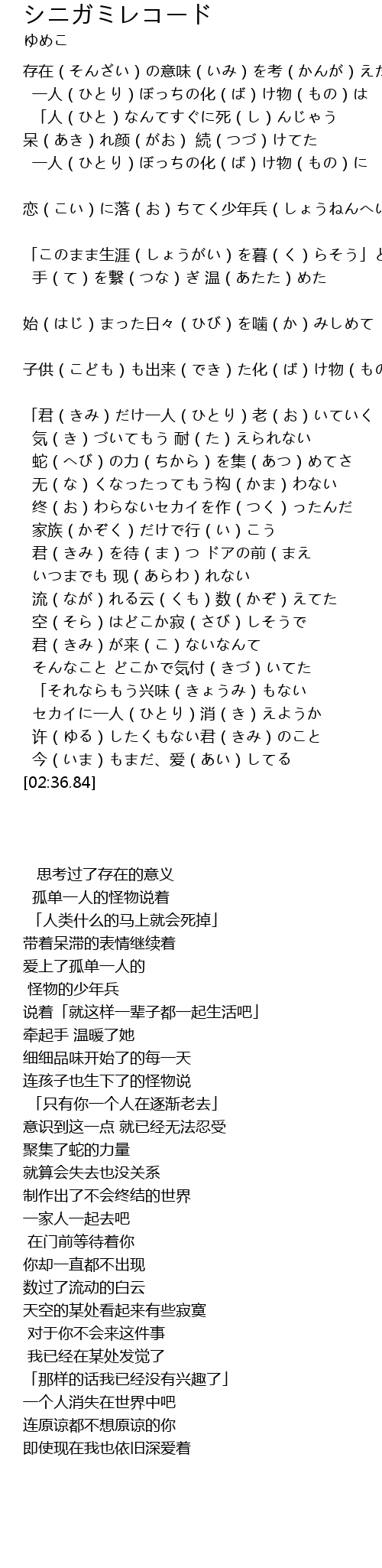 | [00:35.92] | 一人(ひとり)ぼっちの化(ば)け物(もの)は |