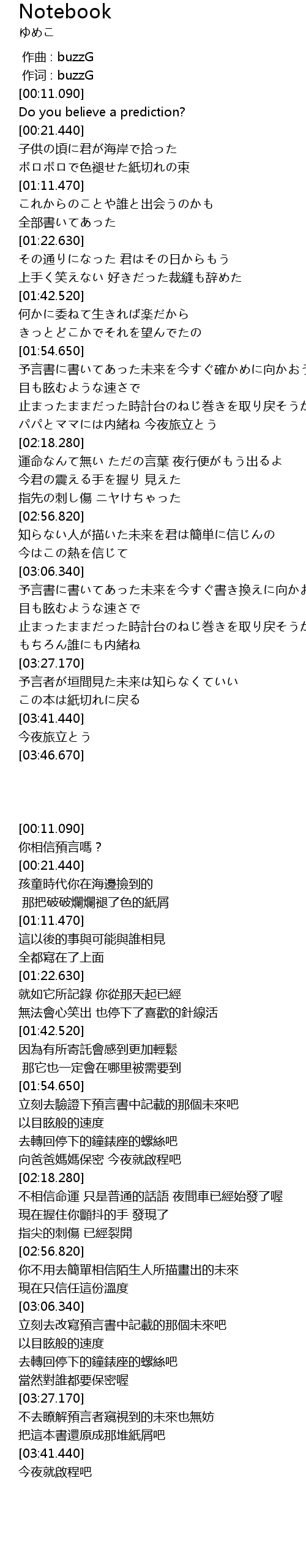 | [02:36.840] | 不相信命運 只是普通的話語 夜間車已經始發了喔 |