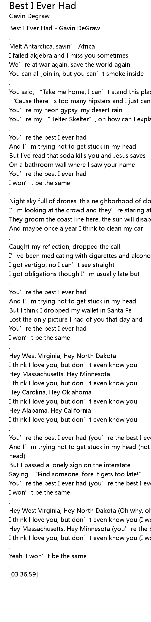 | [00:00.50] | Best I Ever Had Gavin DeGraw |