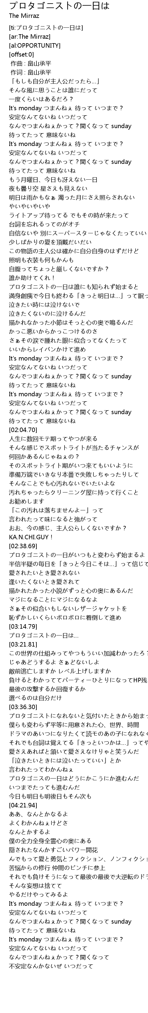 | [00:23.26] | It's monday つまんねぇ 待って いつまで? |