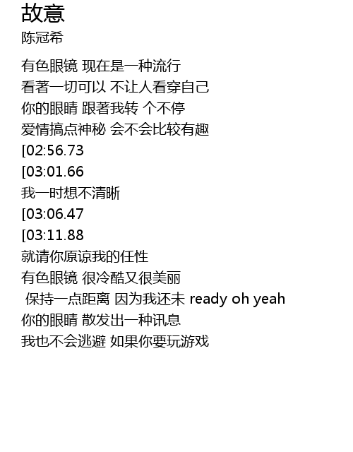 | [03:22.90][02:56.73][02:24.46][01:08.01] | *我爱你却故意 故意说不爱你 |