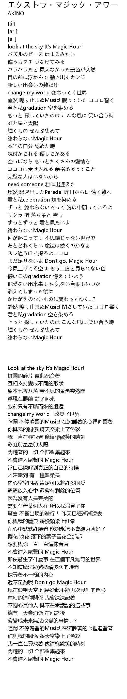 | [00:06.72] | look at the sky It's Magic Hour! |