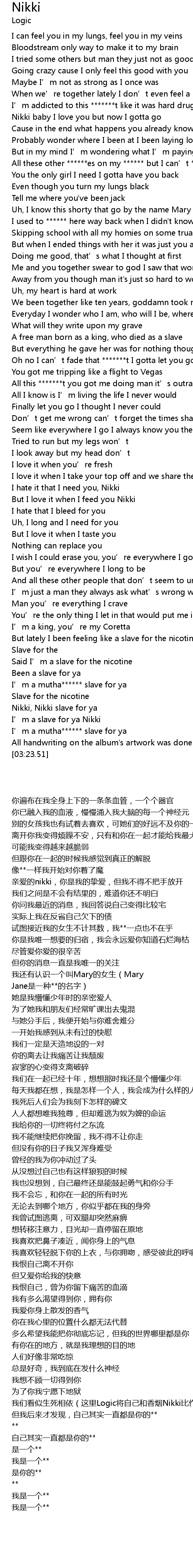 | [02:22.11] | 我们看似生死相依(这里Logic将自己和香烟Nikki比作马丁路德金和妻子Ceretta) |