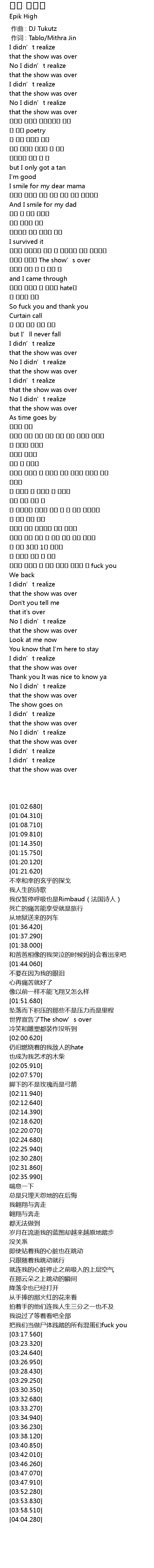 | [00:01.00] | 作词 : Tablo/Mithra Jin |