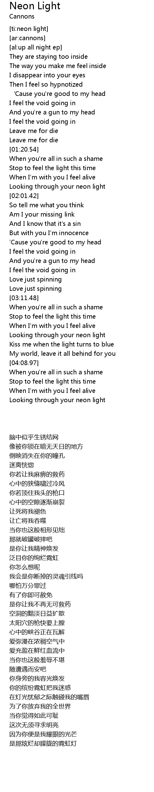 | [04:39.38] | Looking through your neon light |