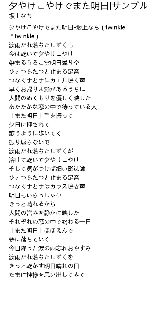 | [00:00.468] | 夕やけこやけでまた明日-坂上なち(twinkle *twinkle) |
