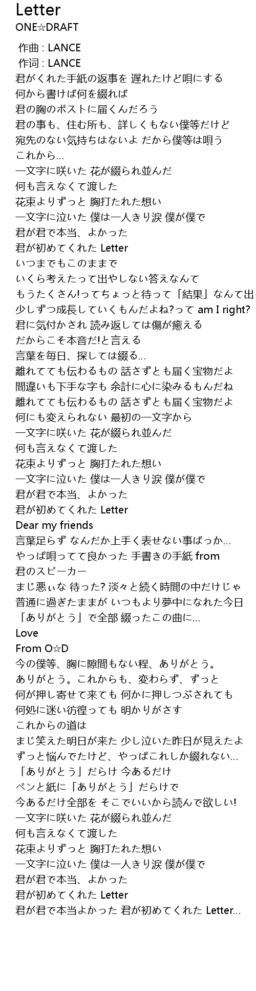 | [02:15.25] | やっぱ唄ってて良かった 手書きの手紙 from 君のスピーカー |