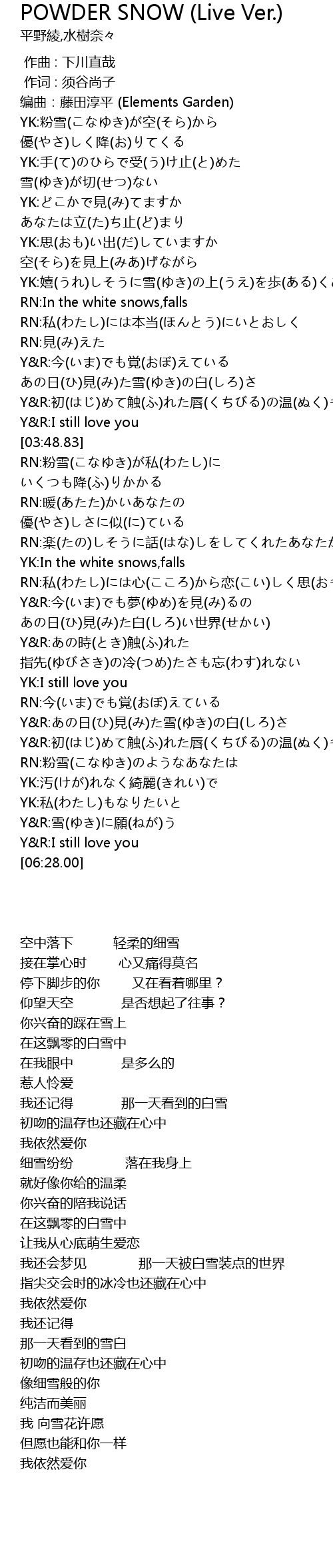 | [02:09.70] | YK:粉雪(こなゆき)が空(そら)から 優(やさ)しく降(お)りてくる |